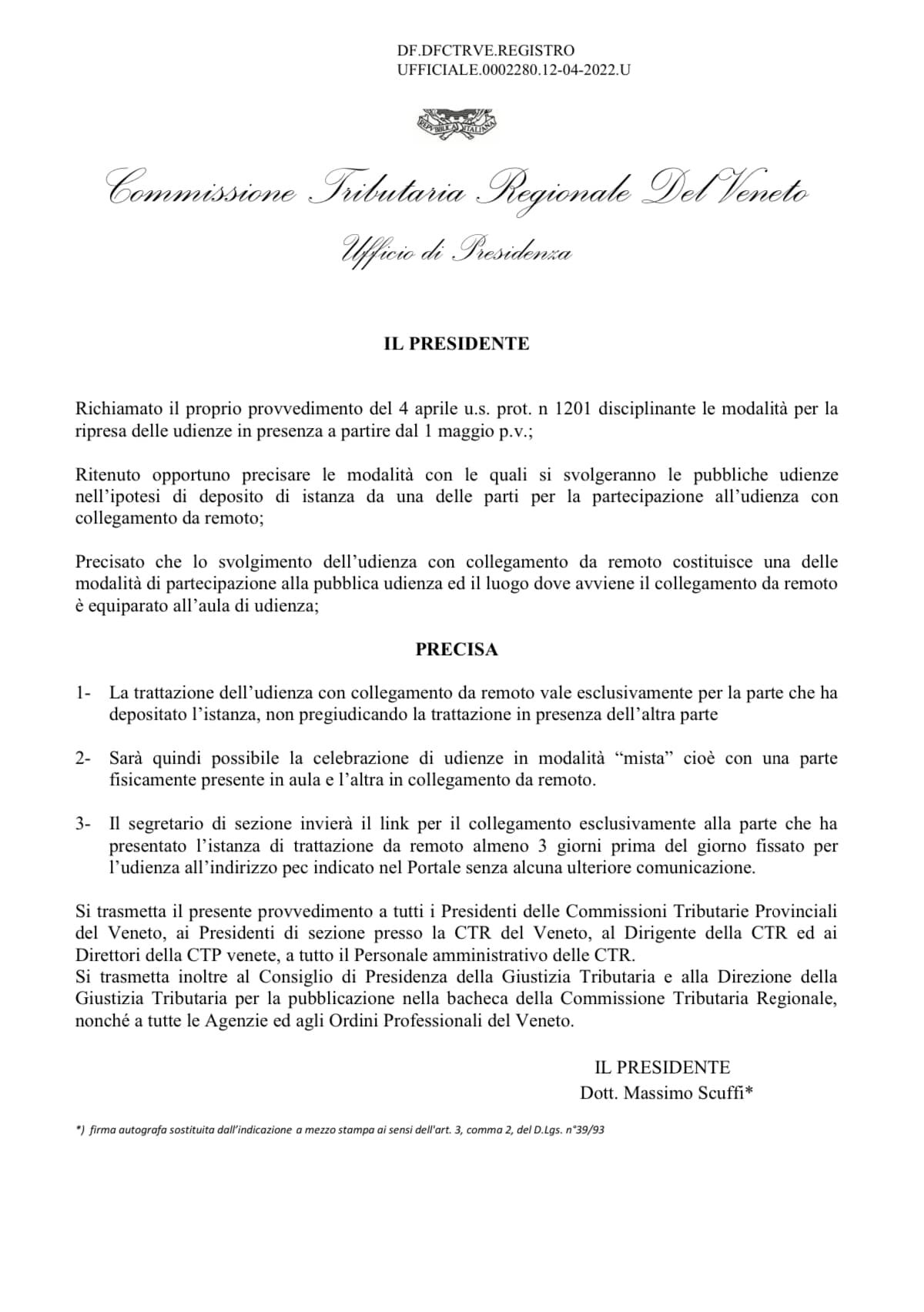 Il presidente della COMMISSIONE TRIBUTARIA REGIONALE DEL VENETO organizza la convivenza tra PRESENZA e REMOTO: possibili udienze MISTE davanti ai collegi in aula.